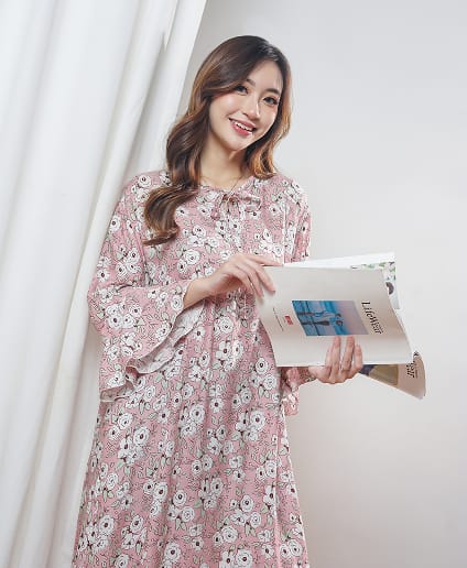 Dress midi dengan rimpel berlengkung unik di bagian depan untuk menambah kesan modern. Lengan berbentuk lonceng, kerah bulat dengan tali pita akan menjadikan home dress ini lebih bergaya. Dengan bahan rayon premium yang adem dan ringan, home dress ini cocok dikenakan untuk kegiatan sehari-hari baik didalam maupun diluar rumah.