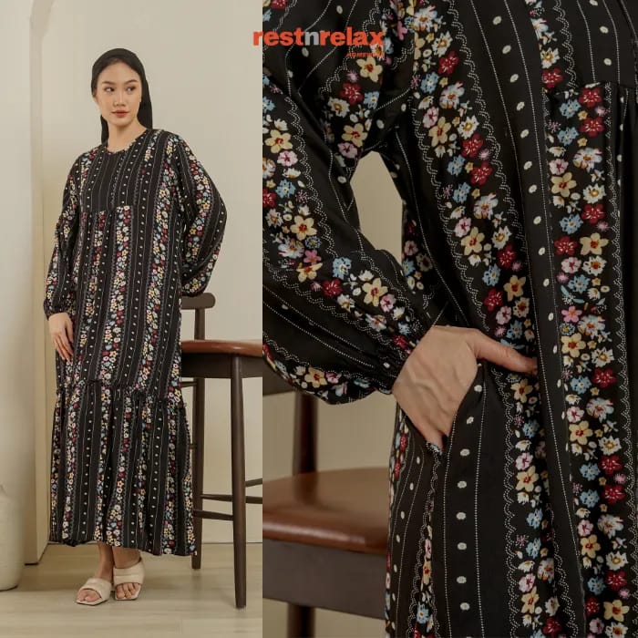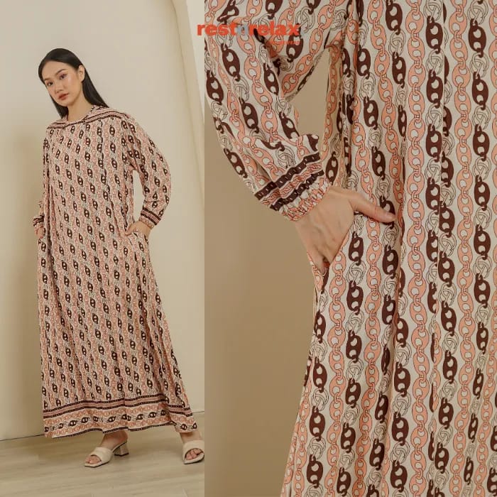 Gamis berbahan rayon yang adem dan ringan untuk aktifitas sehari-hari. Model loose-fit yang dapat menyesuaikan dengan bentuk tubuh Anda. Gamis ini dilengkapi dengan ikat pinggang kain terpisah yang dapat dikenakan untuk penampilan yang lebih bergaya. Kombinasi motif gamis ini akan mempercantik penampilan keseharian Anda.