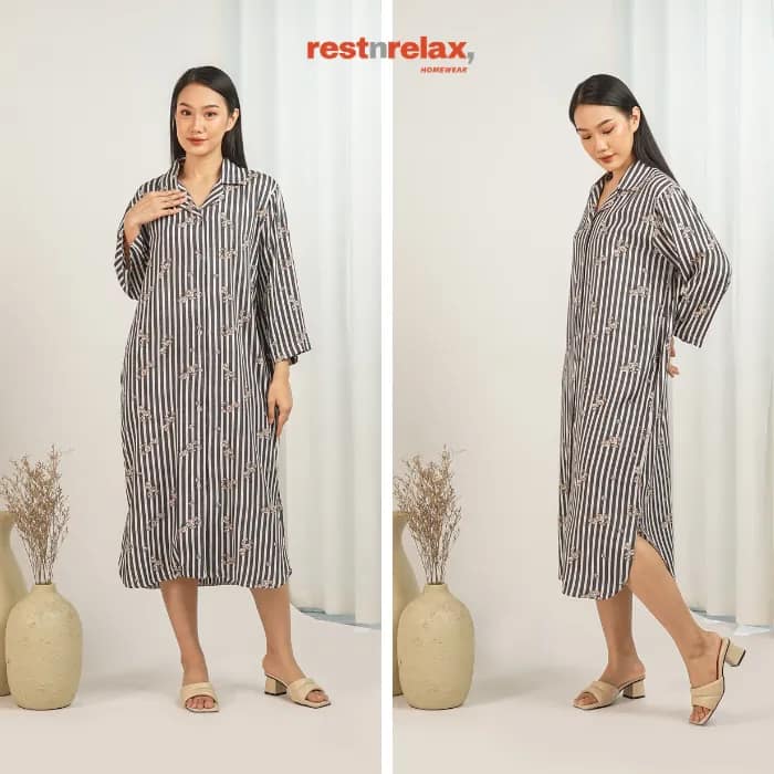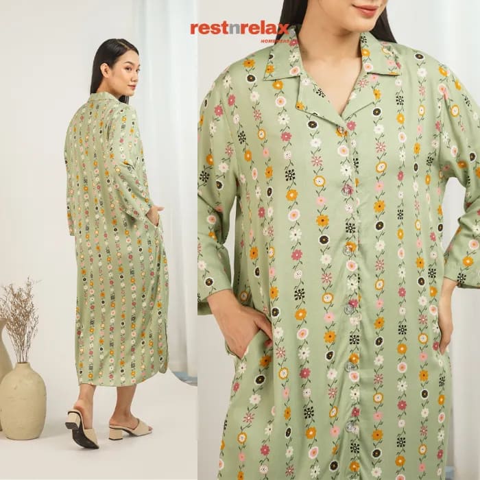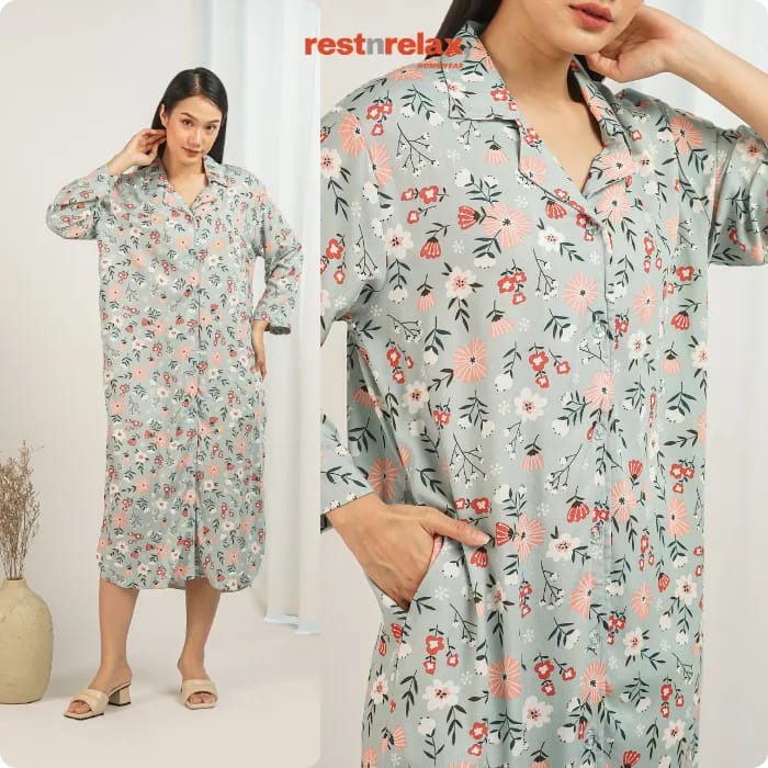 Dress midi loose fit lengan panjang, busui friendly berkancing depan full sampai bawah. Bagian bawah dress berbentuk lengkung dengan belahan samping membuat lebih leluasa untuk bergerak. Dengan bahan rayon premium yang adem dan ringan, home dress ini cocok dikenakan untuk kegiatan sehari-hari baik didalam maupun diluar rumah.