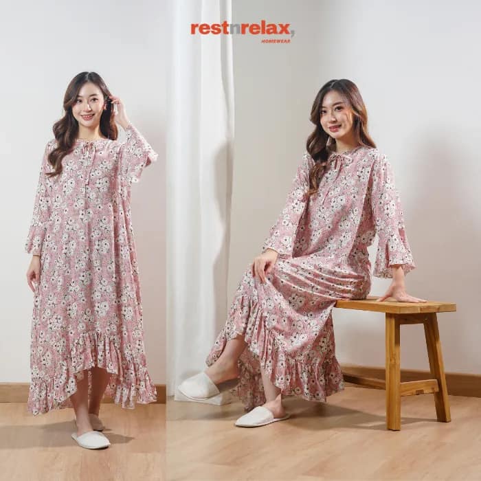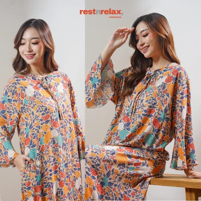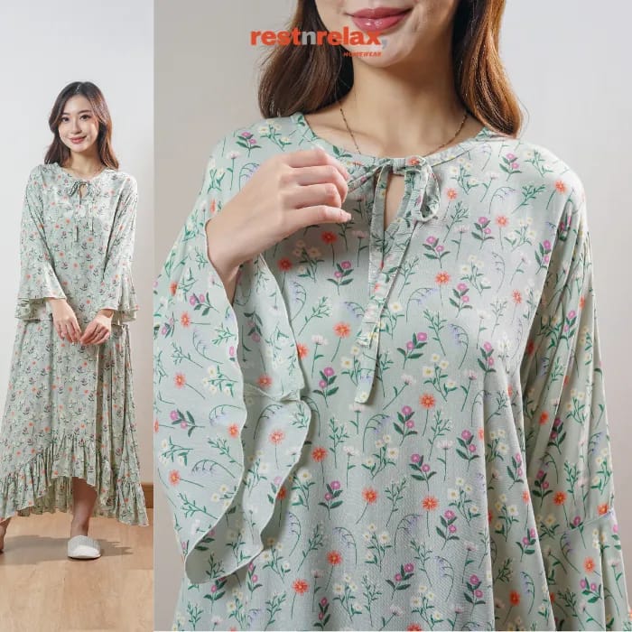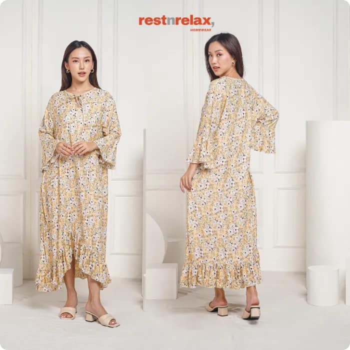 Dress midi dengan rimpel berlengkung unik di bagian depan untuk menambah kesan modern. Lengan berbentuk lonceng, kerah bulat dengan tali pita akan menjadikan home dress ini lebih bergaya. Dengan bahan rayon premium yang adem dan ringan, home dress ini cocok dikenakan untuk kegiatan sehari-hari baik didalam maupun diluar rumah.