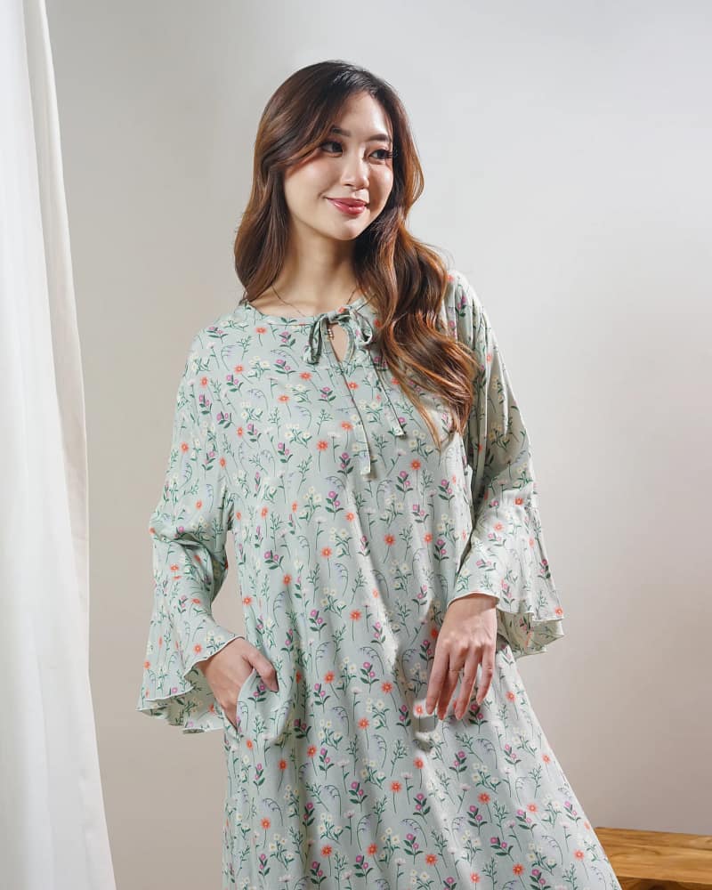 - Lengan 7/8 berbentuk lonceng longgar